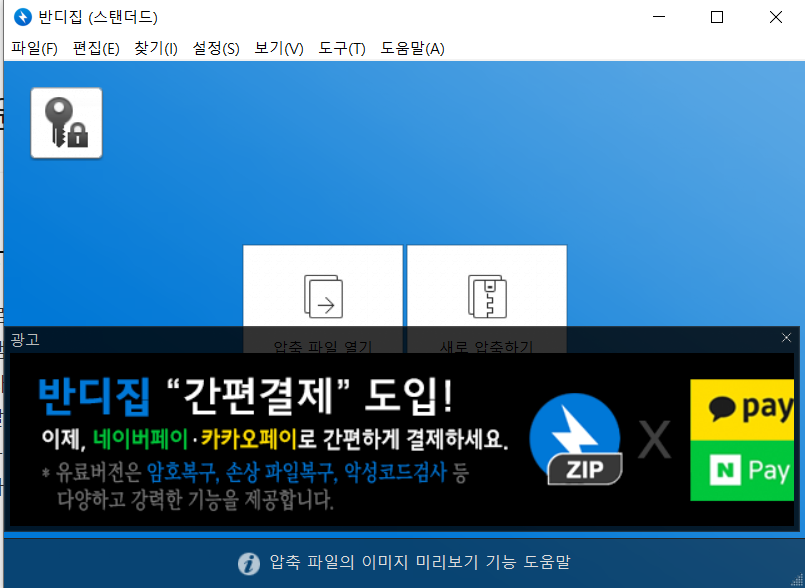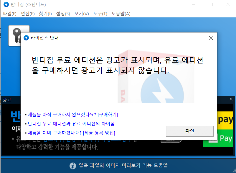 반디집 무료 에디션은 광고가 표시되며, 유료 에디션을 구매하시면 광고가 표지 되지 않습니다.
