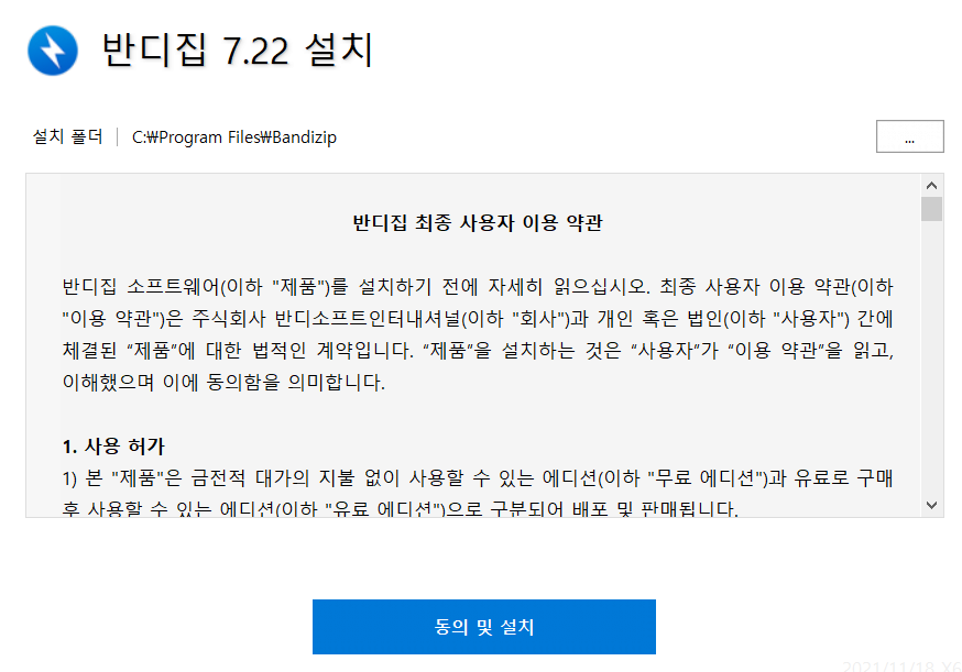 반디집 약관 동의 및 설치 클릭하니 너무 빨리 설치가 되네요,