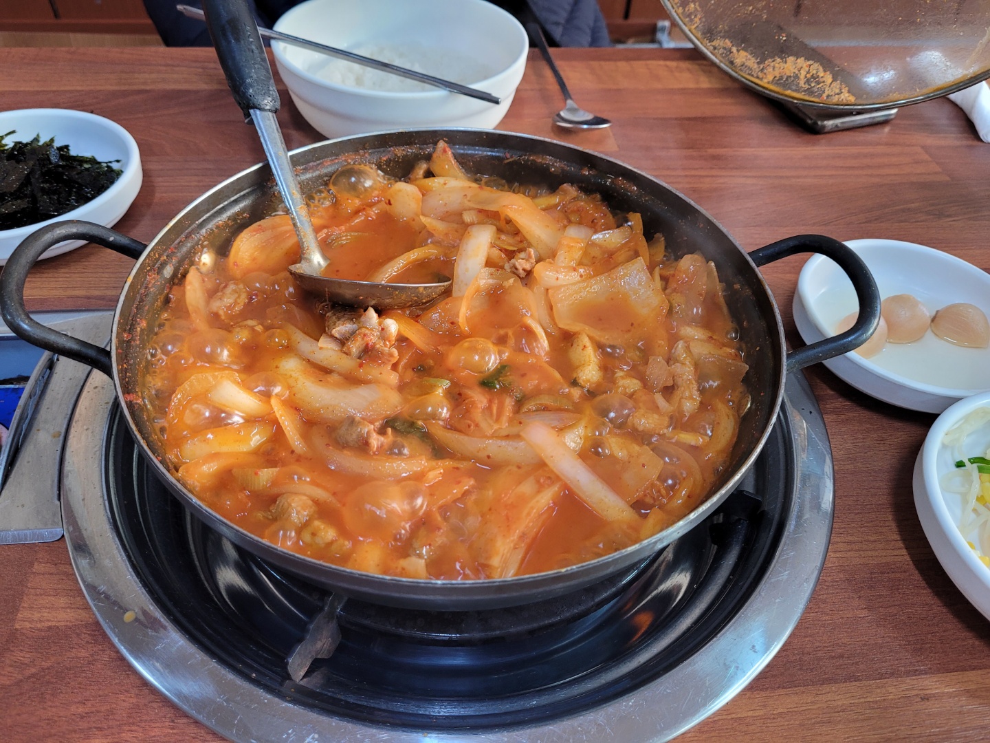 부산 연산동 시골 통돼지볶음 찌개를 다 끓여서 밥 위에 올려서 비비기 직전입니다.