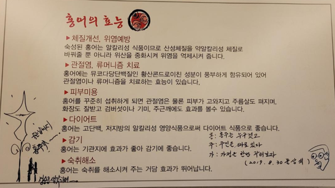 근처에서 지인들과 많이 약주하려 다니는데 홍주가에 들려 홍어를 한 번도 먹지 않았는데