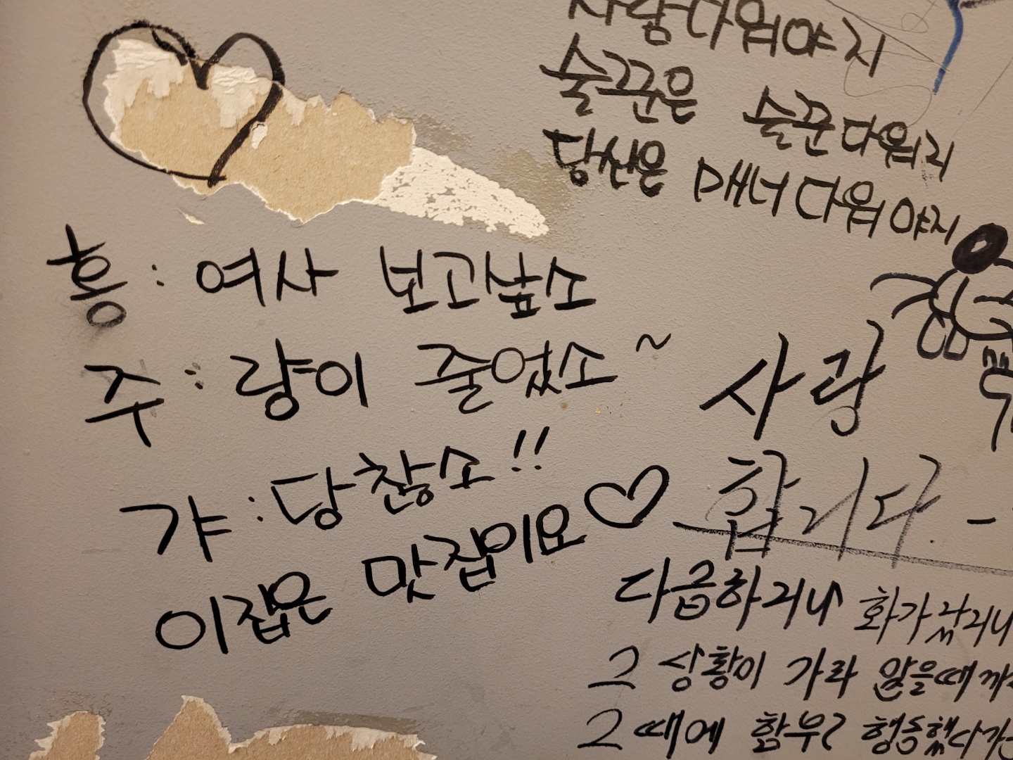 연산동 맛집 홍주가는 삼행시 낙서가 벽에 붙어 있어서 보는 재미가 솔솔 합니다.