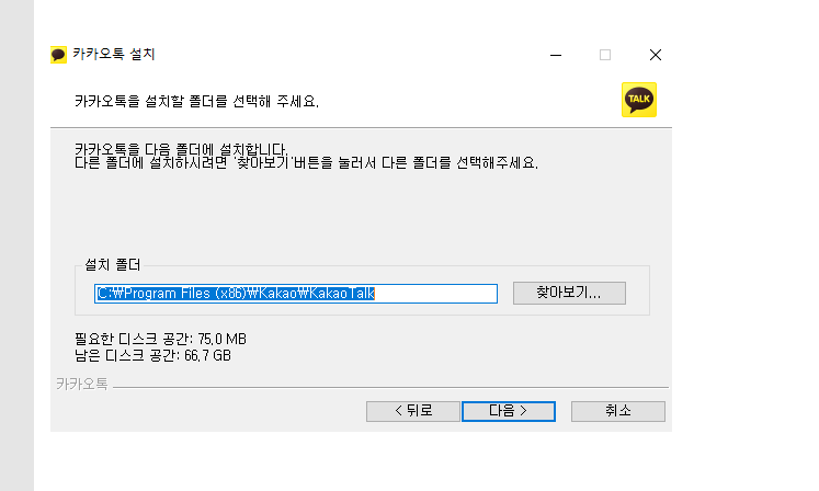 카카오톡을 설치할 폴더를 선택 핵 주세요