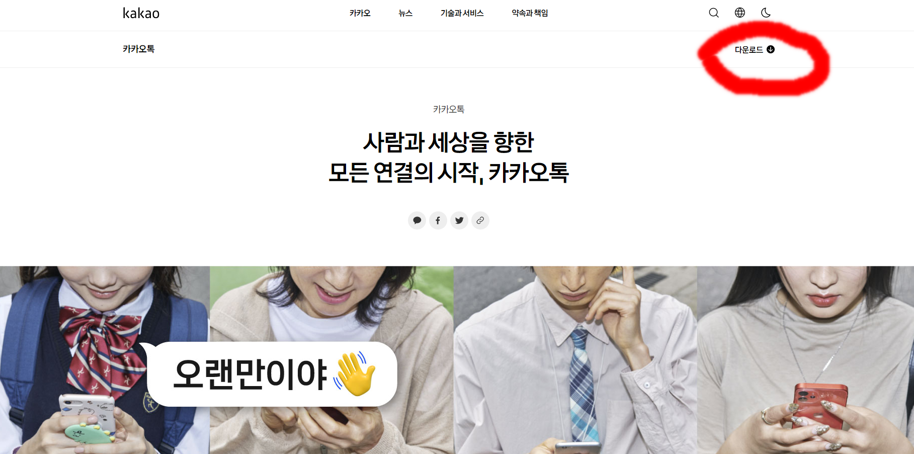 카카오톡 원 화면에서 오른쪽 위의 다운로드를 클릭하면