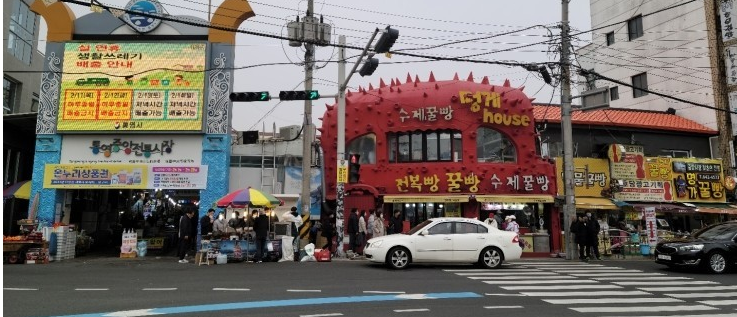 통영 중앙시장 입구입니다. 건너편이 주차장이니 주차 후 길 건너가시면 됩니다.
