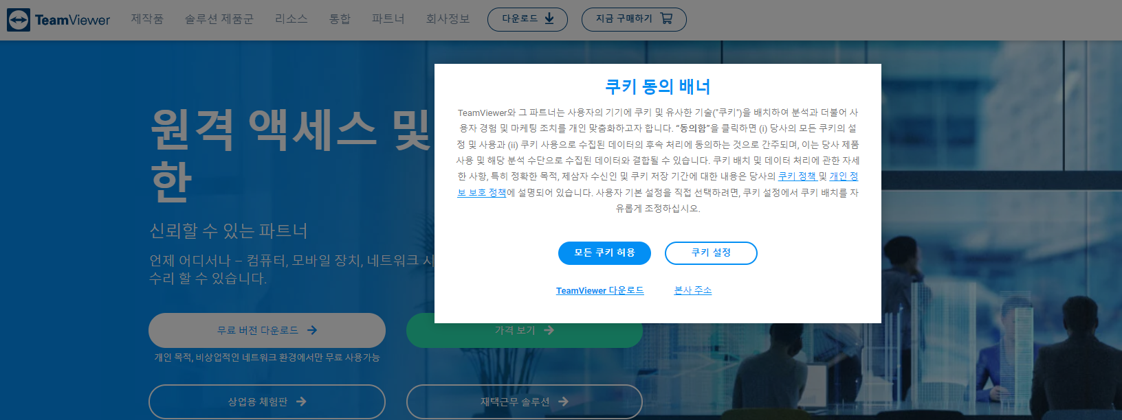 팀뷰어 홈페이지로 들어가려면 아래와 같이 쿠키 동의 배너가 뜨게 됩니다, 모든 쿠키 허용으로 클릭하세요.