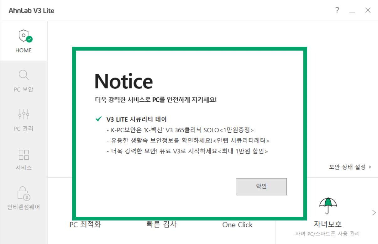 본제 제품은 개인을 위한 무료백신으로 기업, 공공기관은 사용할 수 없습니다.