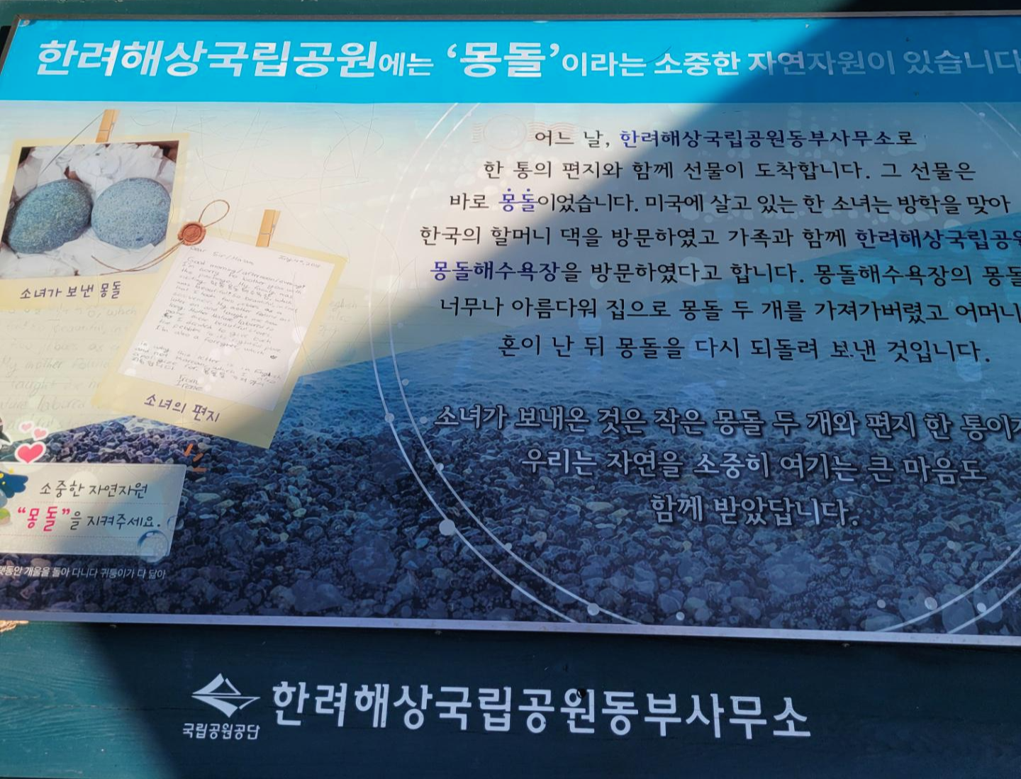 몽돌해수욕장을 방문하였다고 합니다. 몽돌해수욕장의 몽돌이