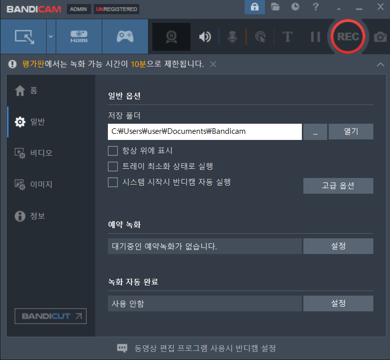 동영상 녹화 프로그램 반디 캠이 설치되었습니다.