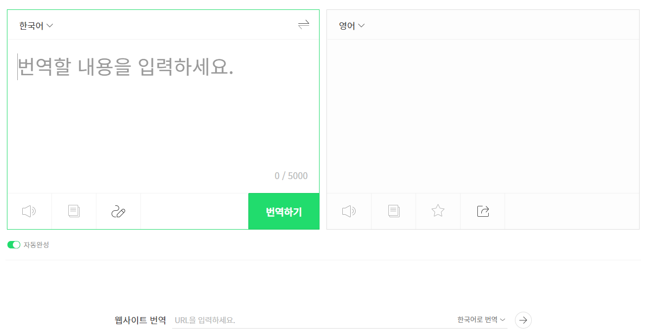 파파고는 왼쪽에 번역할 문장을 입력합니다. 오른쪽은 번역을 받을 언어를 선택합니다.